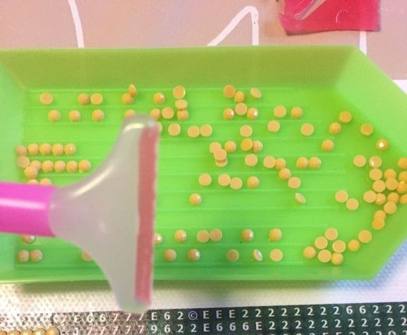 Может выкладывать сразу по 6 страз одного цвета.